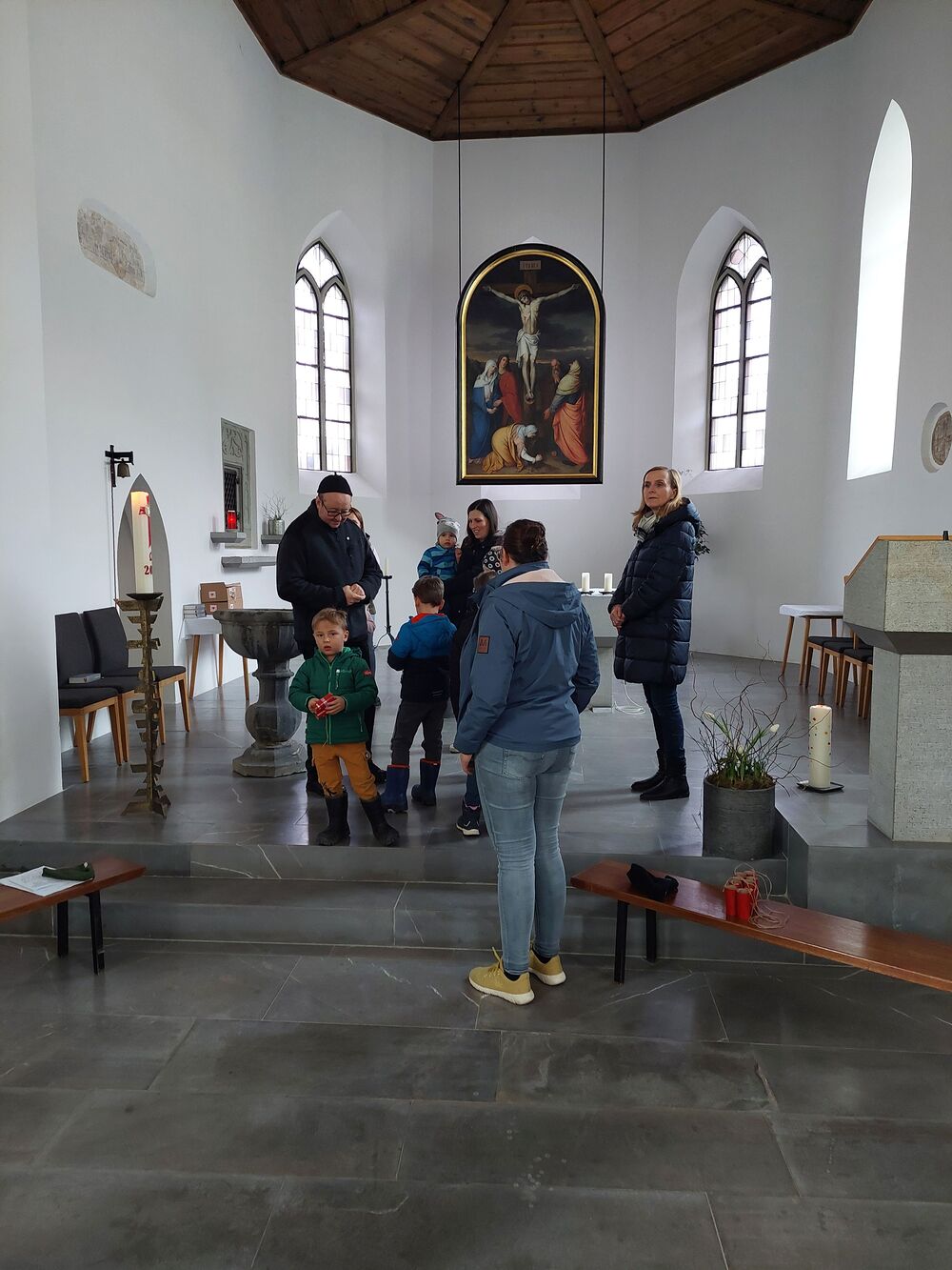 Ein Blick durch das selbstgebastelte Fernrohr und dann ging es los auf Entdeckungstour durch die Kirche. In Gruppen besuchten die Kinder die verschiedensten Stationen. Die Sakristei wurde von Dietmar Hirschbühl erklärt, Pfarrer Ratz ließ die Augen beim neuen Taufbecken, der Osterkerze sowie dem Altar strahlen. Sandra stimmte mit den Kindern die Orgel an und mit Anna wurden bei den Opferkerzen Wünsche zu Gott gesendet und den Beichtstuhl begutachtet. Zum Abschluss durften die Erstkommunionskinder noch den Kirchturm erklimmen.